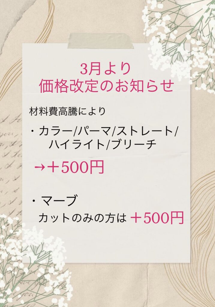 2026/03/02 こんにちは! 今月から、材料費高騰により一部メニューの価格を変更させていただくことになりました。 今後も技術・サービスの向上に努め、よりご満足いただけるよう努力してまいります! 何卒よろしくお願いいたします。 お問い合わせはこちら